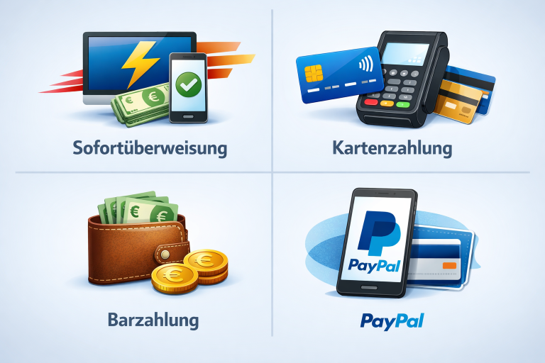 Bei uns können Sie bequem zwischen mehreren Zahlungsmethoden wählen. Wir akzeptieren Barzahlung, Kartenzahlung, PayPal (+5,00€ Gebühr) sowie Sofortüberweisung. So haben Sie die Möglichkeit, die für Sie passende und einfachste Zahlungsart auszuwählen – ganz flexibel und unkompliziert.