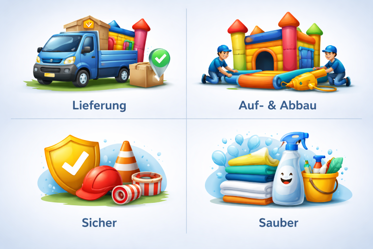 Wir legen großen Wert auf einen reibungslosen Ablauf bei der Lieferung, sowie dem Auf- und Abbau unserer Hüpfburgen. Wir sorgen dafür, dass die Hüpfburg pünktlich an Ihrem Veranstaltungsort ankommt und sicher sowie fachgerecht aufgebaut wird. Nach der Veranstaltung kümmern wir uns ebenfalls um den Abbau der Hüpfburg, sodass Sie sich um nichts weiter kümmern müssen.