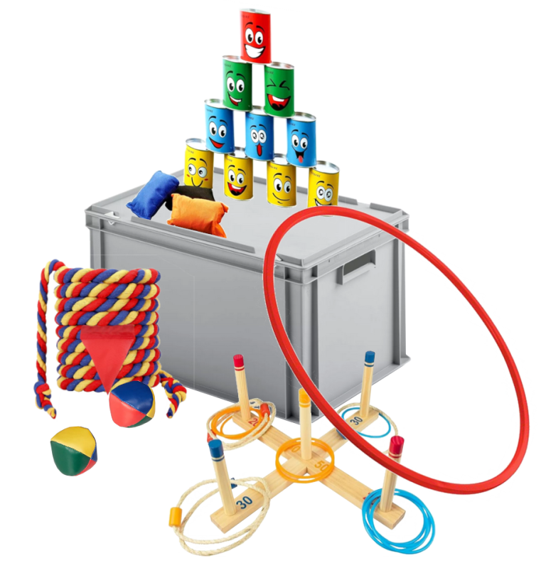 Inhalt: Ringwurfspiel, Sackhüpfen, Eierlauf, Stelzen, gr. Schwungtuch, Pferdegeschirr, Tauziehen, Springseile, Hoolahoop, TicTacToe, Dosenwerfen, Jonglierteller u.v.m.