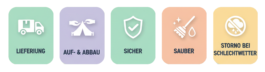 Unser Sortiment umfasst neben den Hüpfburgen auch unter anderem Stehtische, Tische mit passenden Stühlen, Partyzelte in verschiedenen Größen, Heizpilze für kühlere Abende sowie stilvolle Dekorationen. Gerne unterstützen wir Sie dabei, Ihre Veranstaltung passend auszustatten - wir freuen uns auf Ihre Anfrage!